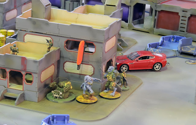My third game was against one of the lads from Bolton (sorry mate for not remembering your name). We played highly classified. It was one of those games that just happened to go my way. My opponent had set up his Bulleteer, engineer and and Hospitaller behind cover nice and bunched up. To my luck my Briscard with heavy rocket launcher could only see the engineer who was facing away from him! Two shots went into him and hit everything around killing the remote and the engineer. Then I noticed he had one line troop hidden way at the back who was a complete lieutenant obvious. Ir was really really far away from my force but playing the style I do I easily had enough orders to hunt her down. With a few orders pumped into one of my Chasseurs I snuck into position and opened fire taking her out with one shot. After that my Loup Garous went to town doing as much damage as I could then tried to clean up the missions with my Alguacil Hacker. I feel bad for bitching about him in a previous entry as he got me 4VPs in this game.